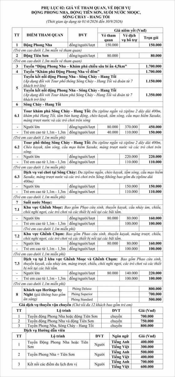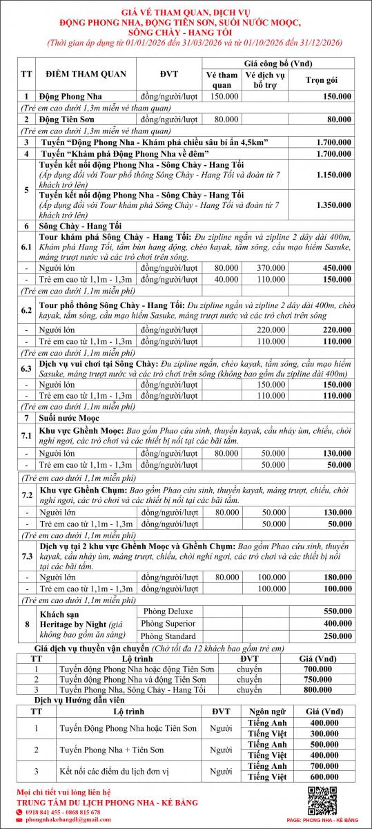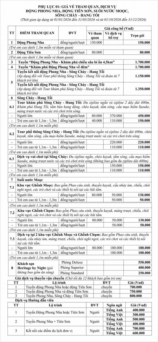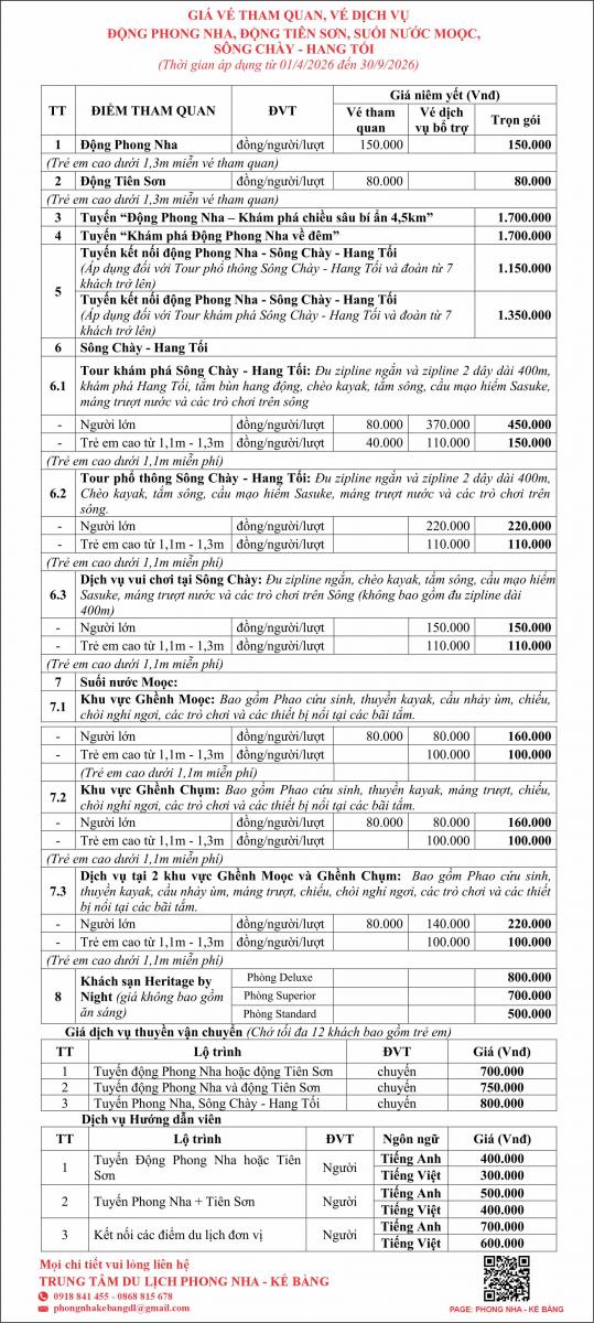 THÔNG BÁO GIÁ VÉ THAM QUAN, DỊCH VỤ NĂM 2026